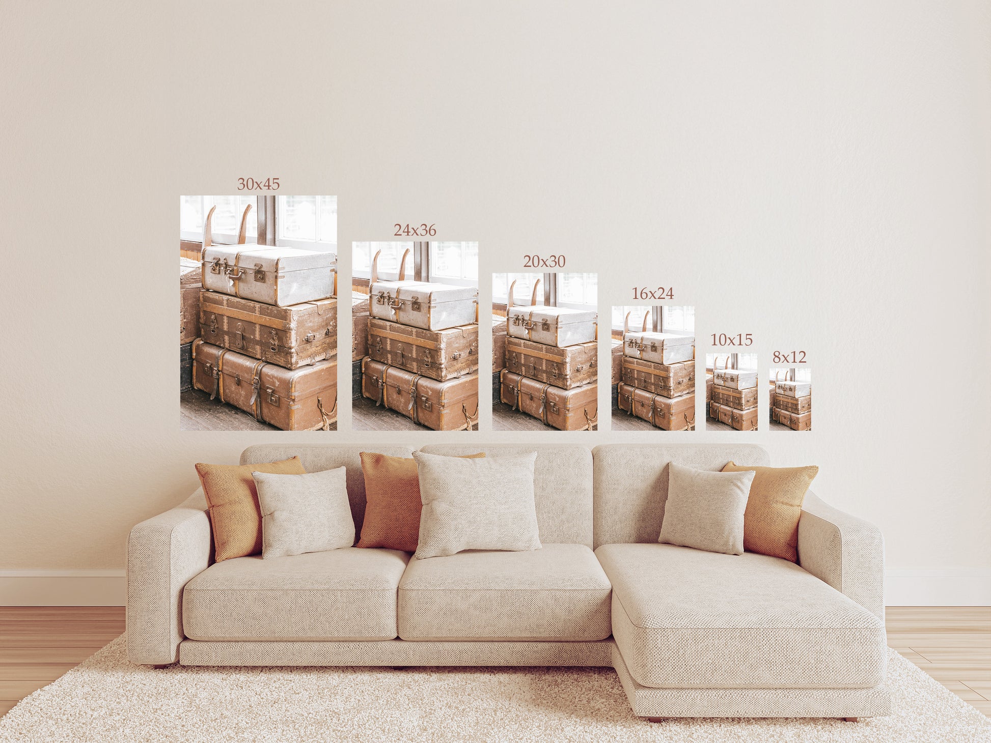 A timeless collection of weathered suitcases and travel trunks, this vintage luggage wall art brings rustic charm and nostalgia to your home. Captured in soft natural light, the photograph showcases the rich textures and warm tones of well-traveled cases stacked neatly together — evoking stories of journeys past and adventure ahead.